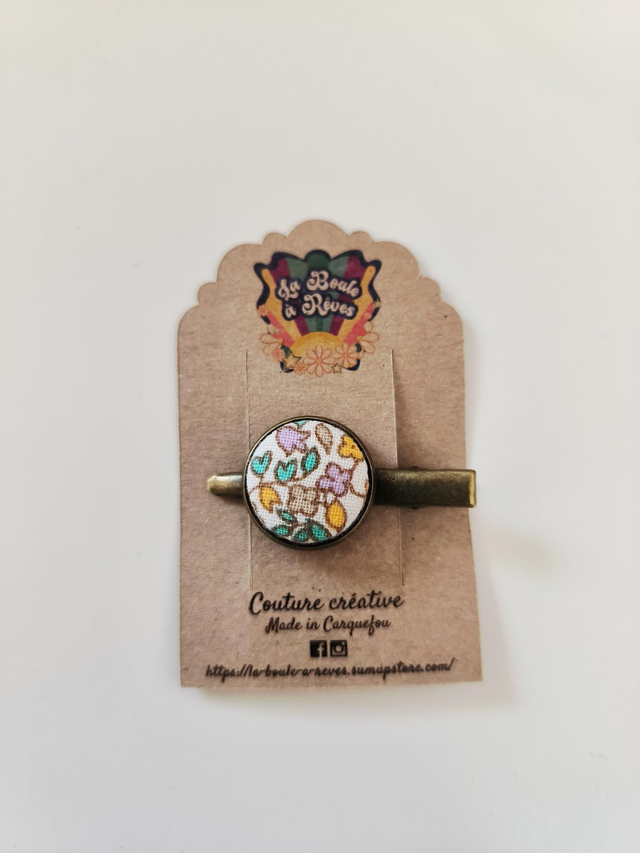 Cette barrette est réalisée avec du tissu et un support en métal finition bronze.