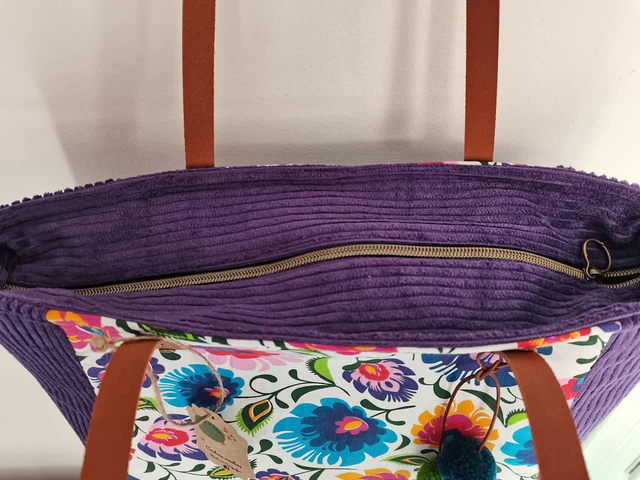 Le modèle Ellen est un sac en velours côtelé et coton, avec des sangles en cuir.