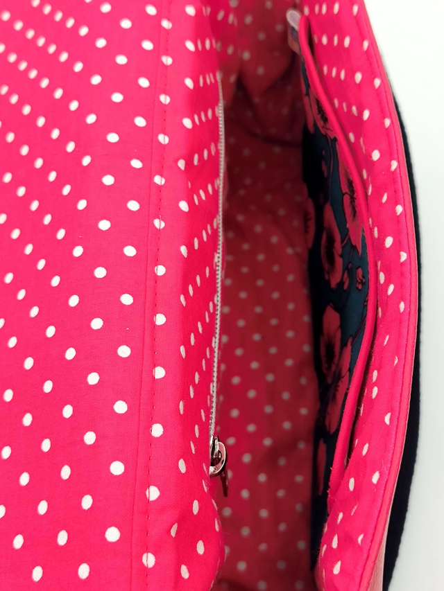 - Intérieur : doublure en coton. 2 poches intérieures (1 plaquée, 1 zippée).
